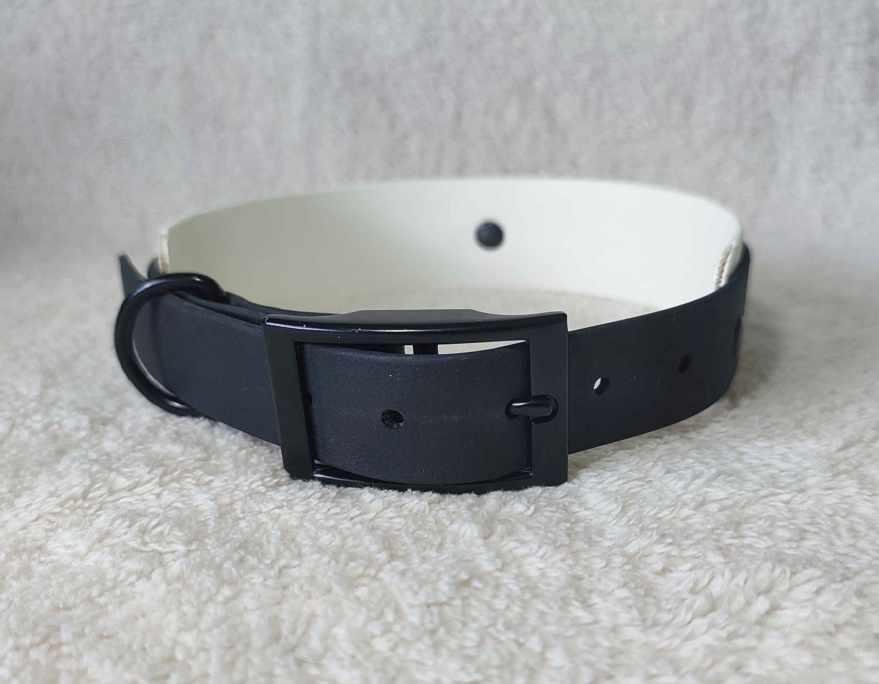 Ve spodní části obojku je bílé biothane 38mm a horní černá 25mm. Obojek je pro obvod krku 43 - 52cm.