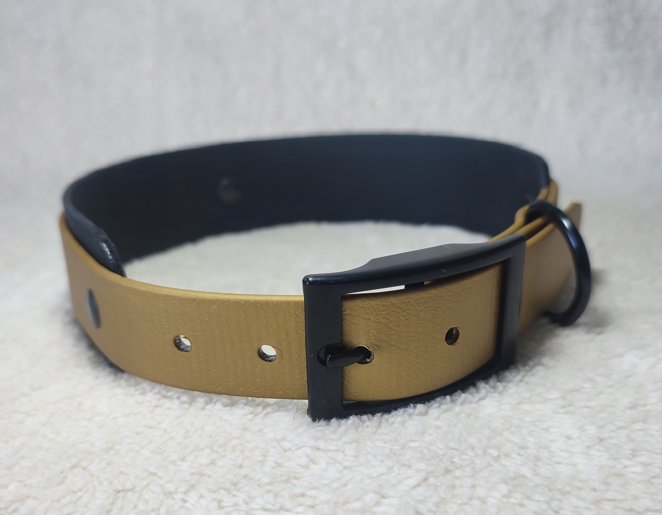 Černá 38mm a zlatá 25mm s černým kováním. Obojek v této kombinaci je krásná a elegantní kombinace.