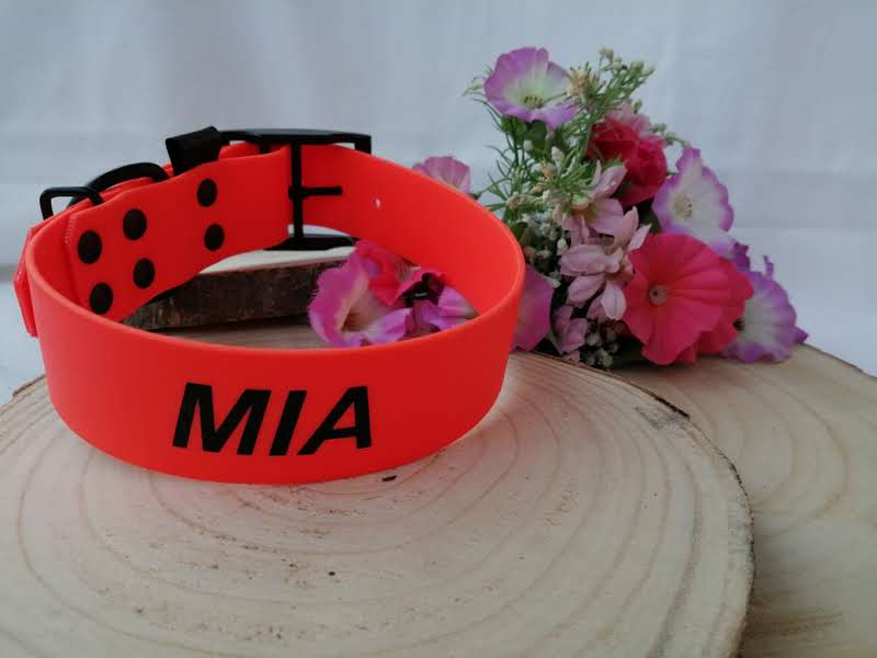 Biothane obojek v šířce 38mm v dobře viditelné oranžové barvě s tiskem a černým kováním.