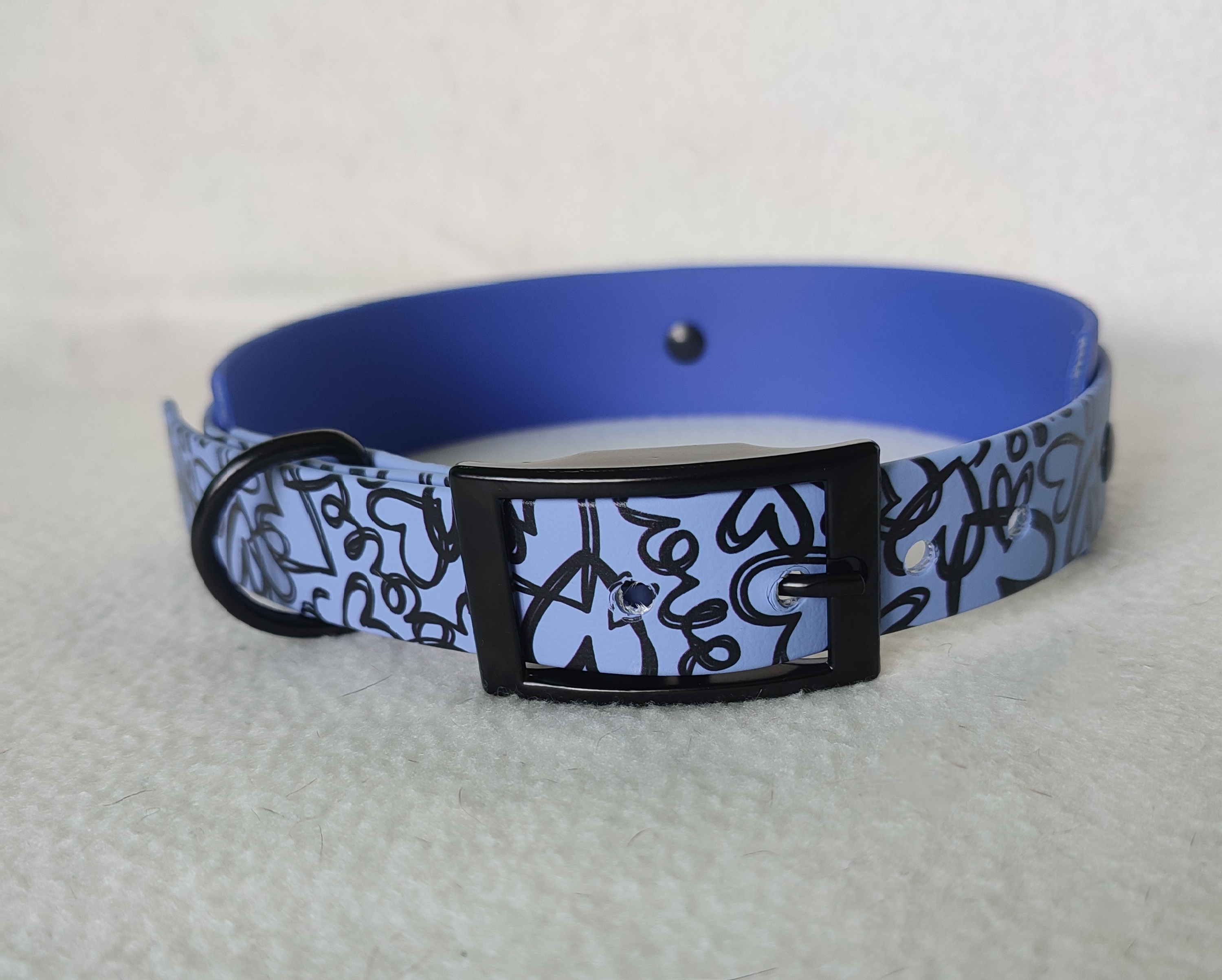 Horní část - vzor je v barvě priwinkel s černým tiskem srdíček, šířka 25mm