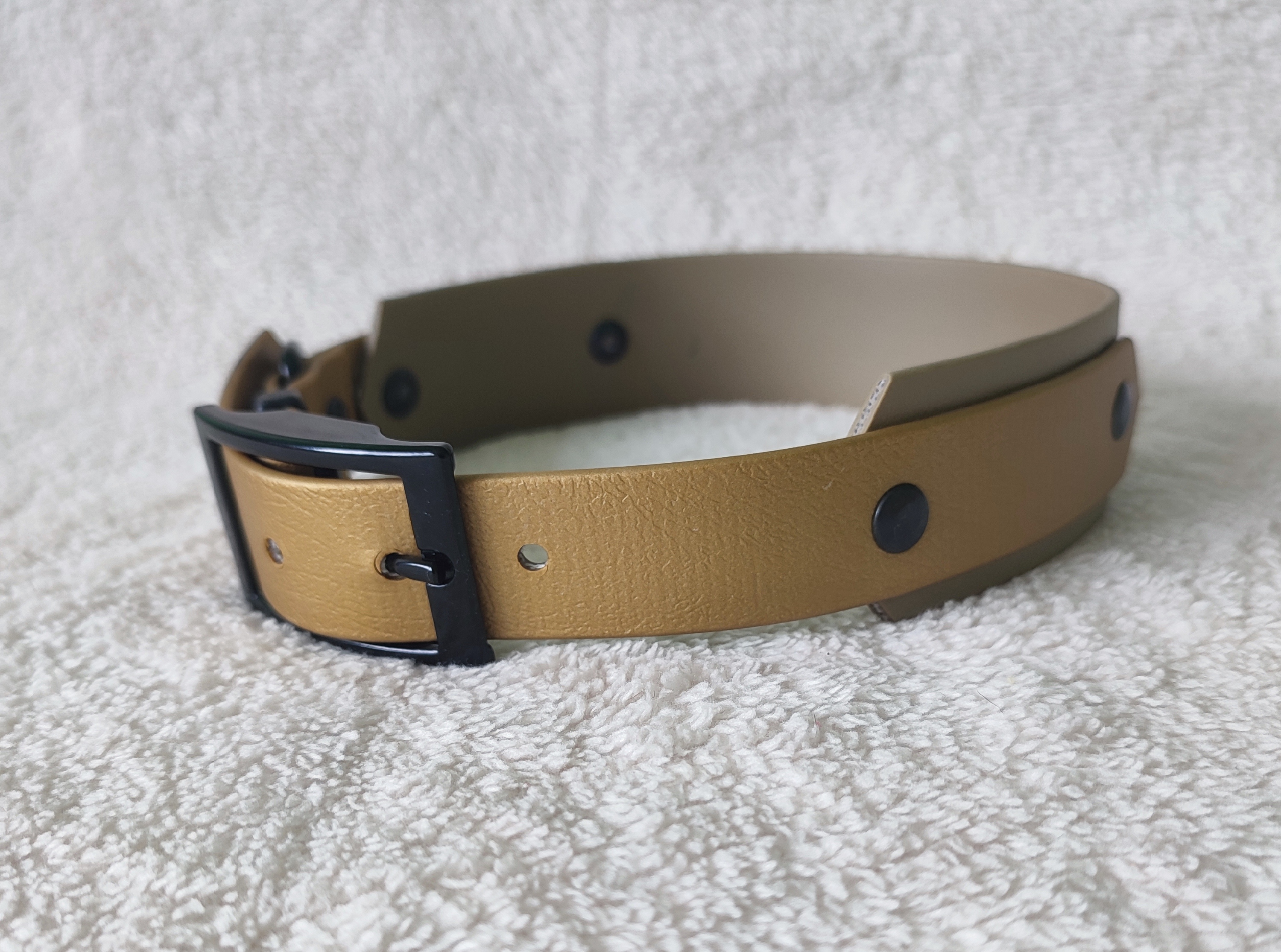 Širší část obojku je v šířce 38mm, barva khaki. Úzká část je šířka 25mm, barva zlatá. Doplněno černým kováním.
