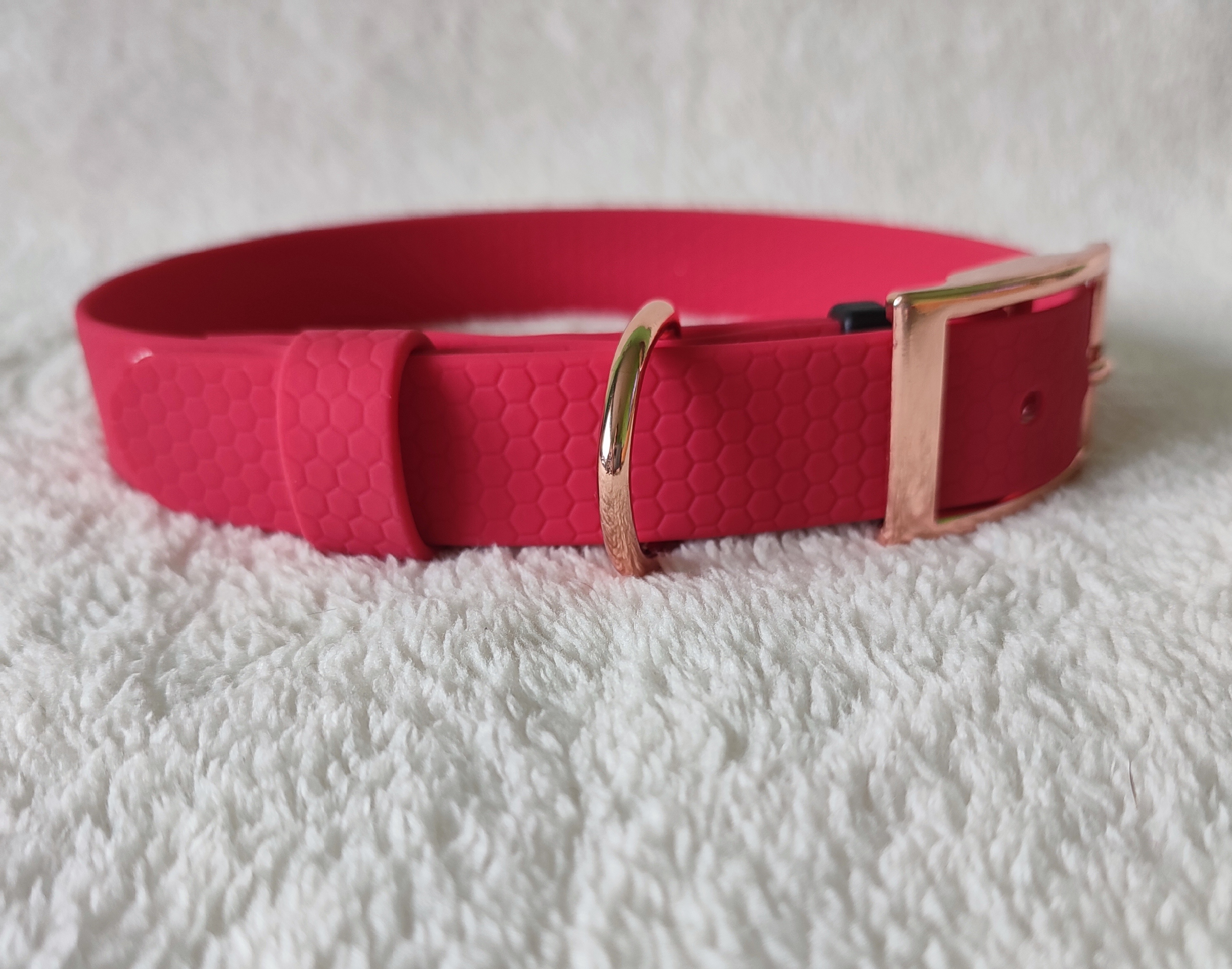 Nádherně sytá barva viva magenta na hexa popruhu, který je omyvatelný vodou, nevytahuje se, je měkký a velice příjemný. Obojek skladem má kování v barvě růžové zlato.  Ráda pro Vás obojek vyrobím i se stříbrným nebo černým kováním. Stačí si jen vybrat z nabídky. celý popis