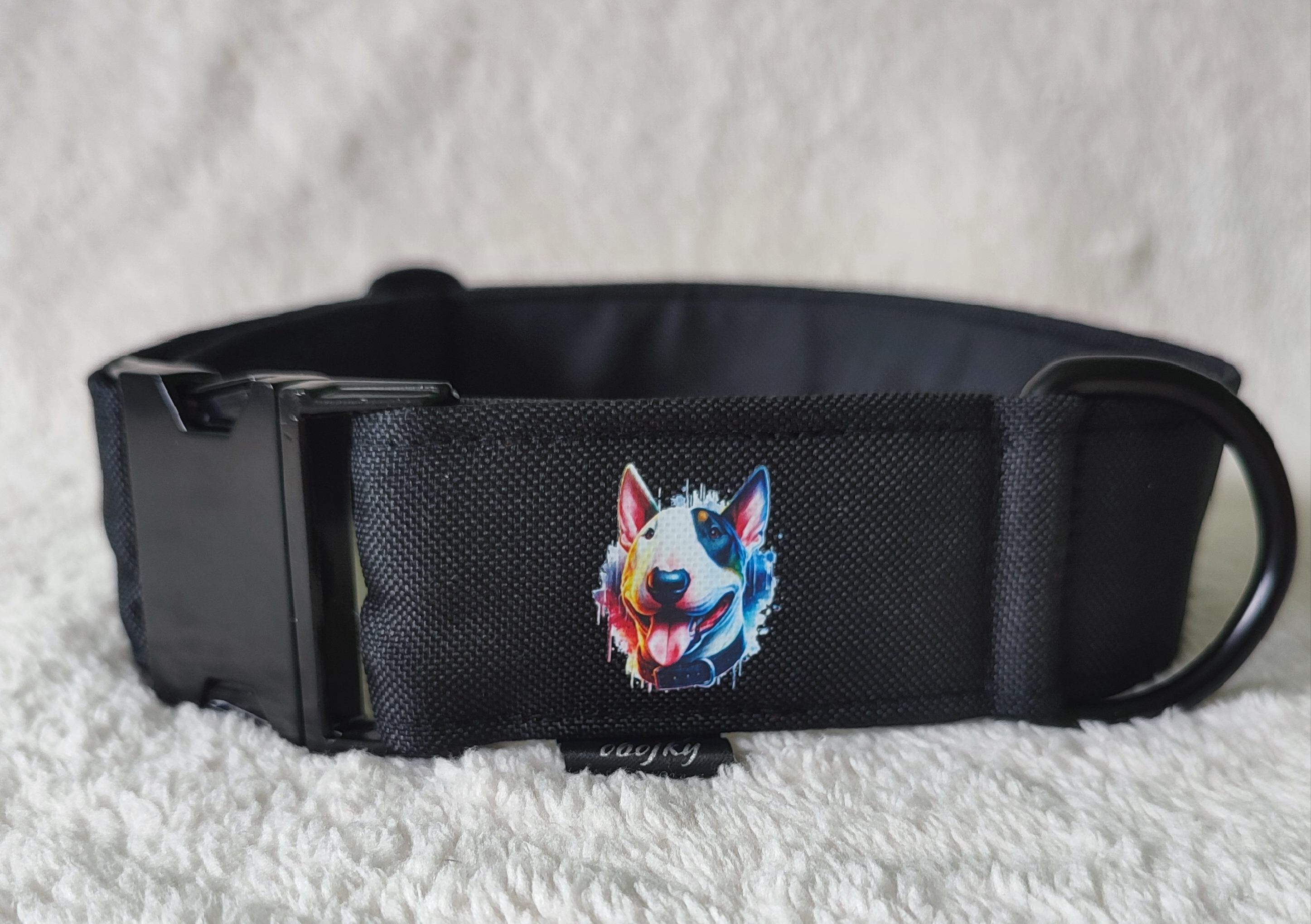 Málo kdy se dá najít obojek s potiskem plemene psa a tak vznikl nápad s potiskem plemen. Obojek je kvůli tisku široký 4cm. Zapínání je na kovový trojzubec, ale může být třeba i černý, plastový nebo trojzubec zátěžový. Obojek je možné vyrobit i jako bezpečnostní ( vodítko se zapíná do dvou D kroužků nad trojzubcem. Tím zapínání nenese takové zatížení.)