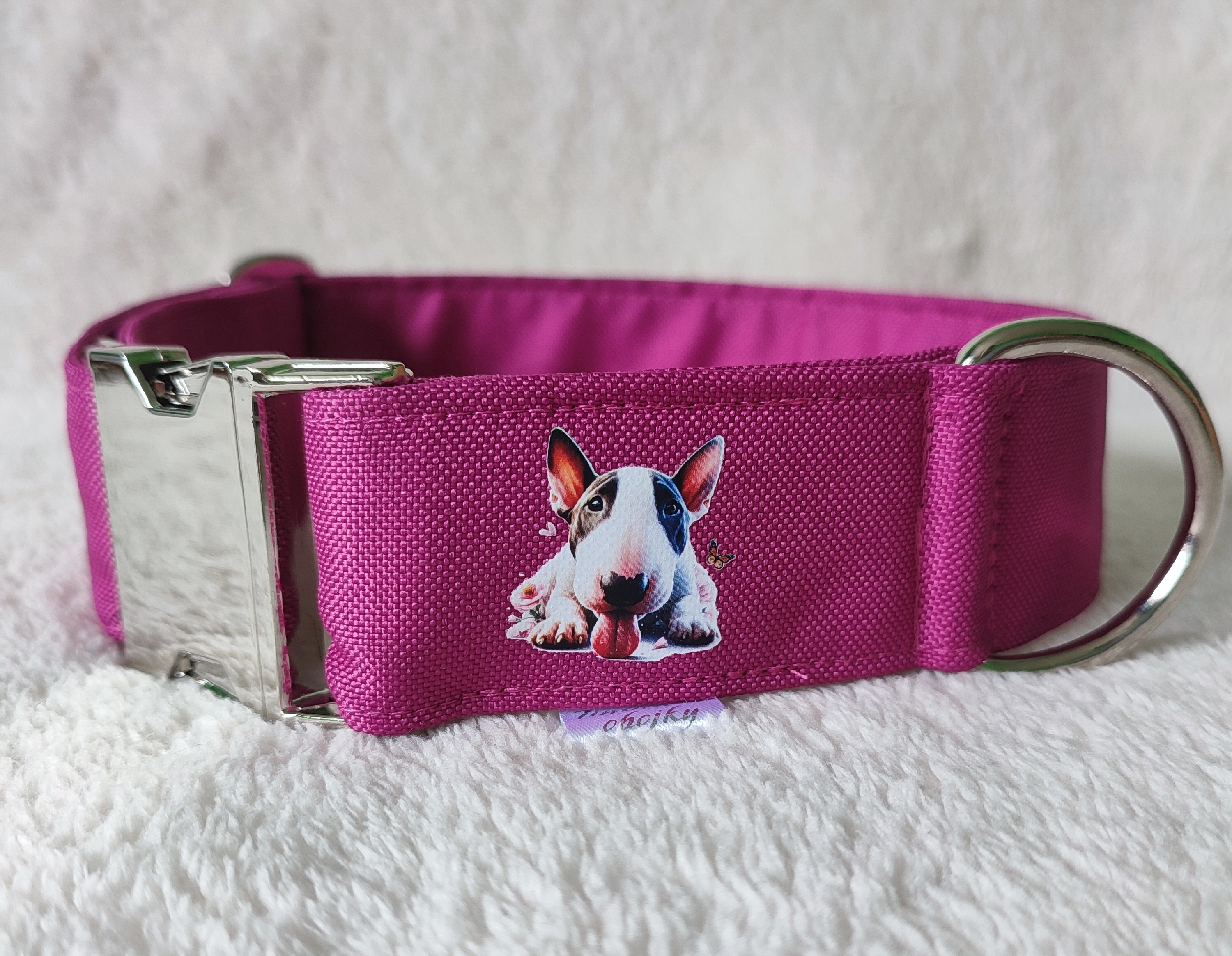 Pro psí holčičky bulteriérů je zde obojek v barvě fuchsie a tiskem bulteriéra s malou růžičkou u levé tlapky a s motýlkem u pravé tlapky.