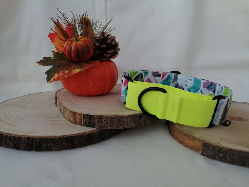 Polostahovací obojek martingale s krásnými neon barvami a kontrastním černým kováním. Stahování je samostatný kousek provlečený sponami.