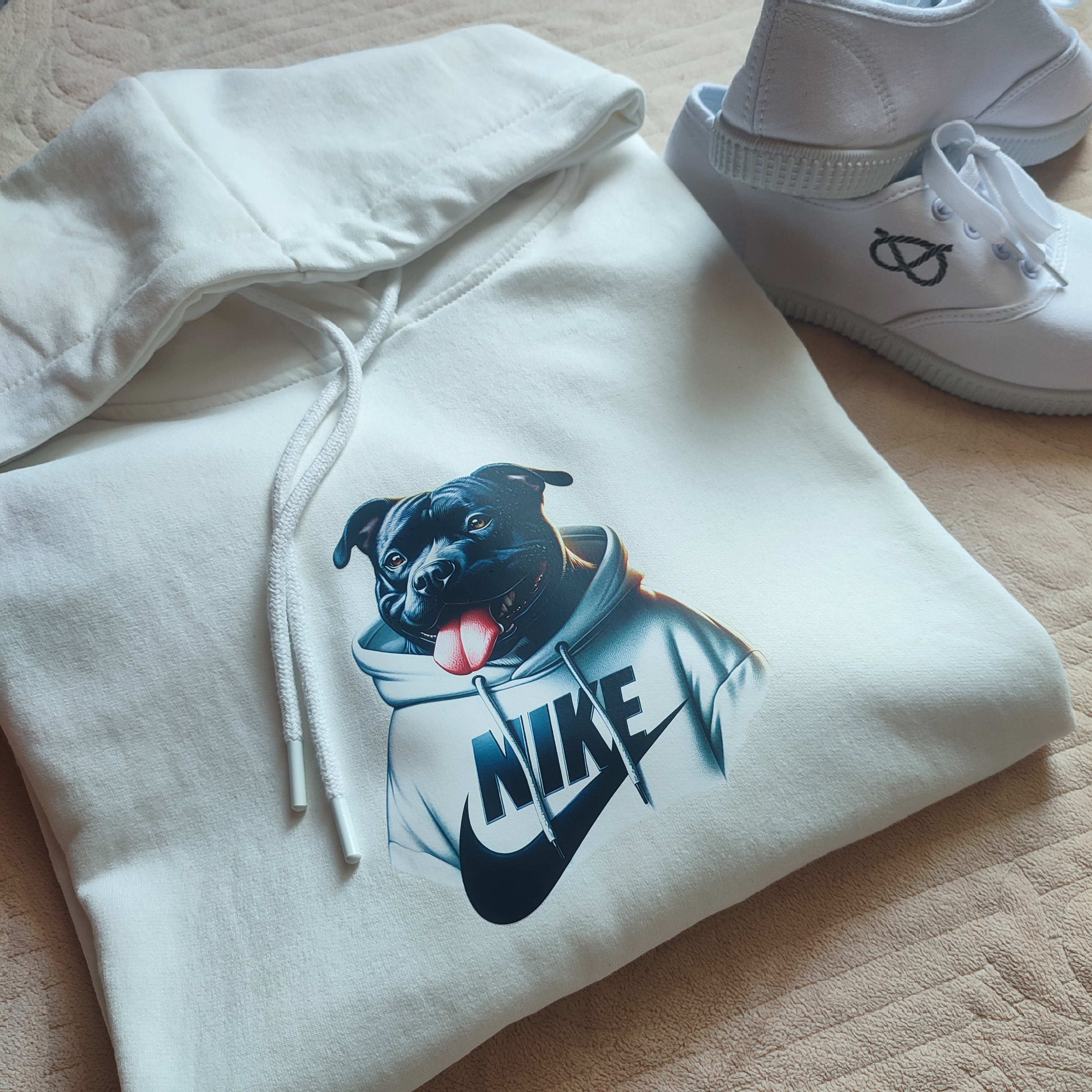 Potisk staffbull v bílé mikině je i na světlém podkladu dobře viditelný, velice pěkný a přitom decentní.
