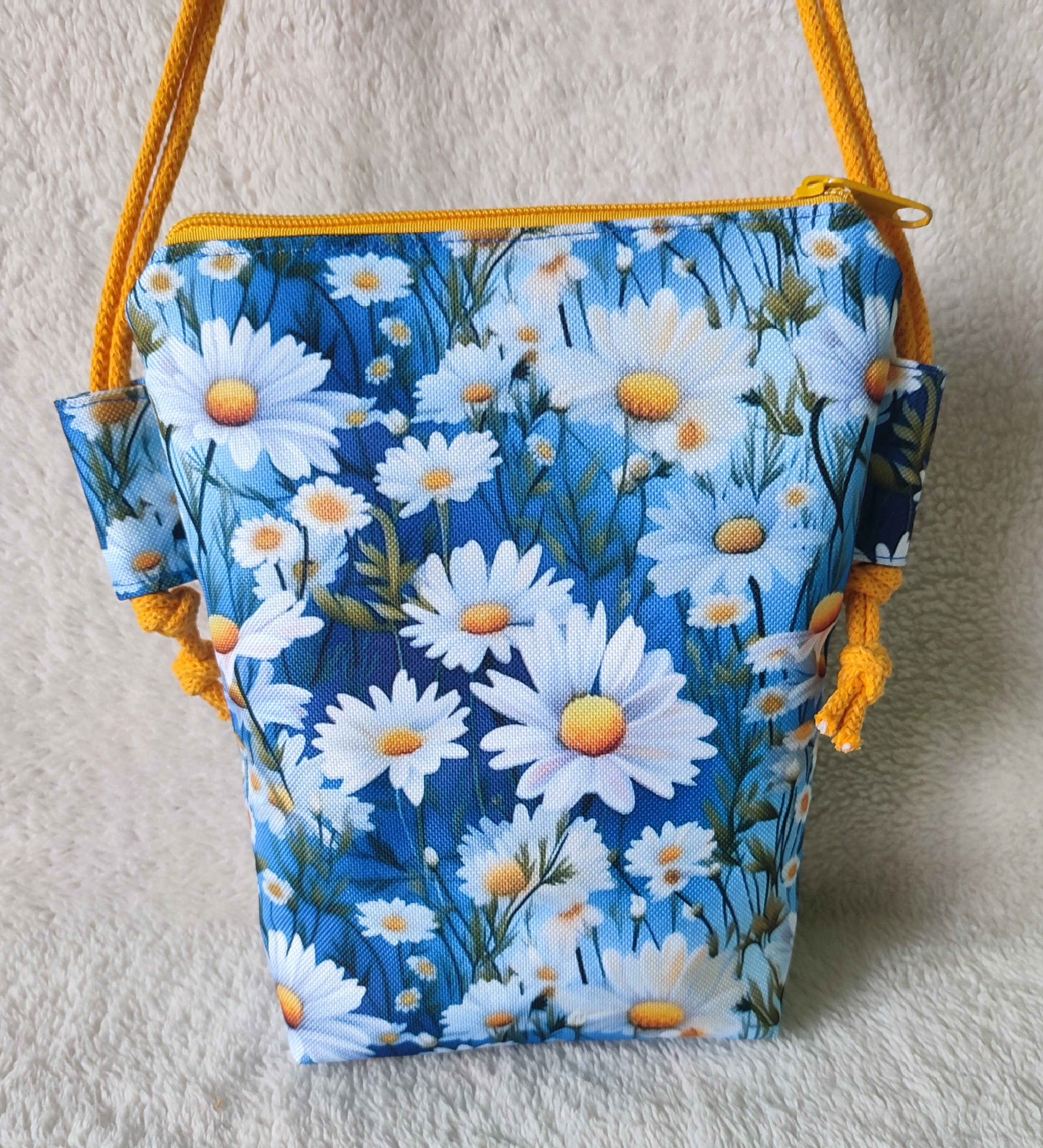 Letní mini kabelka se vzorem kopretin, které neodmyslitelně k létu patří. Žlutá barva šňůrky a podšívky doplňuje barvu kopretin.