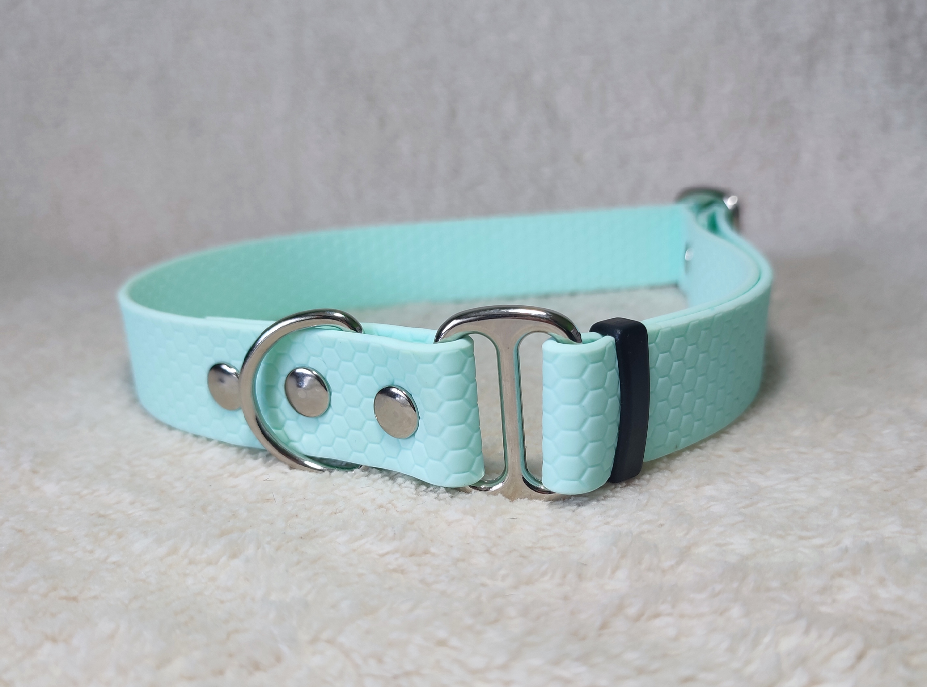 Obojek přes hlavu - bez zapínání a stahování z voděodolného popruhu hexa. Neocenitelný pomocník pro psí vodomily a blátomily.  Očistíte pod tekoucí vodou , v případě většího zašpinění můžete použít i mýdlo a kartáč. Hexa popruh na obojky je maximální šířce 2,5cm celý popis