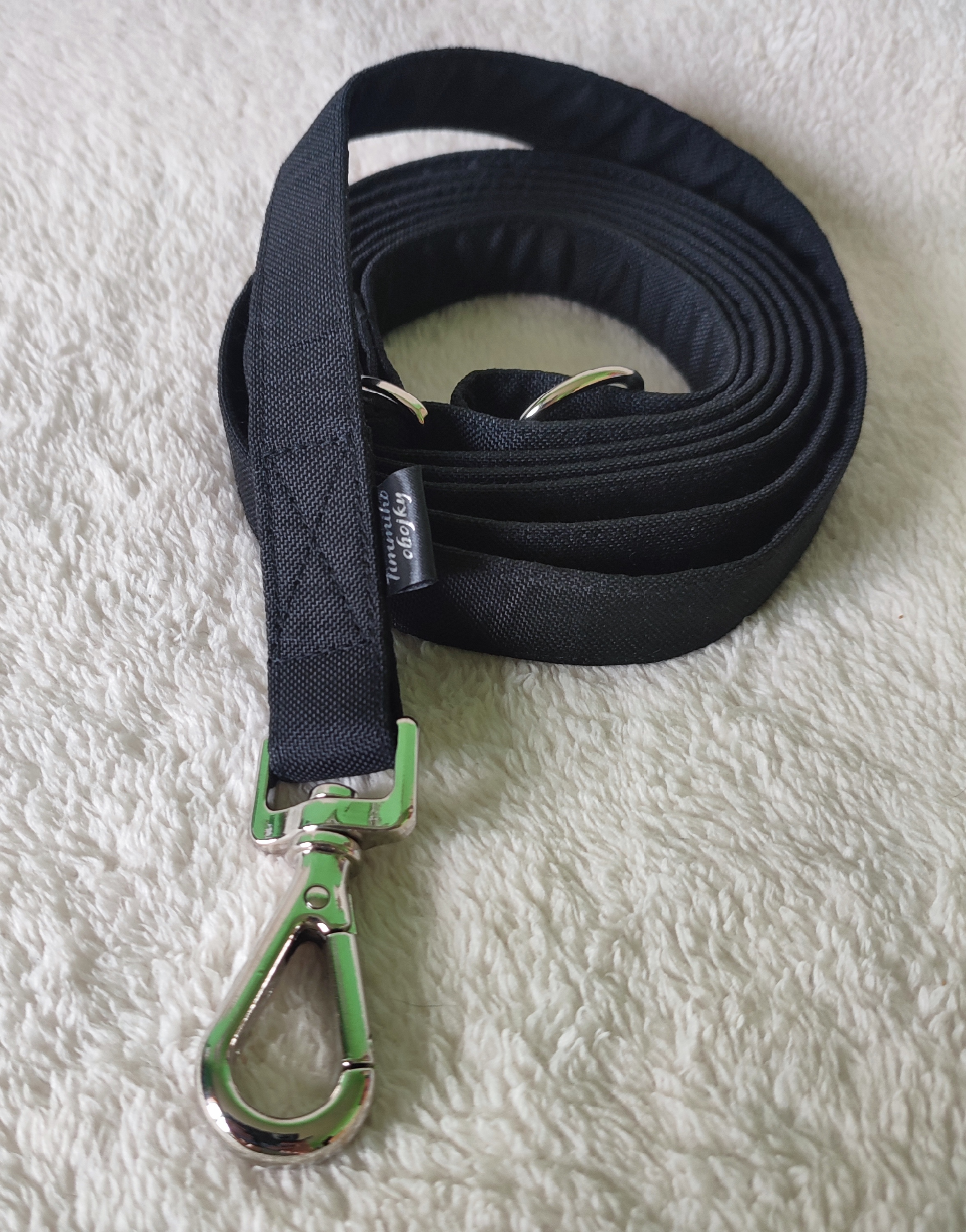 Vodítko má šířku 2cm a délku 135 - 240cm. Je ušito z černé kočárkoviny a uvnitř je pevnostní popruh. Kočárkovina je odolná, pevná a částečně i odolá vodě.